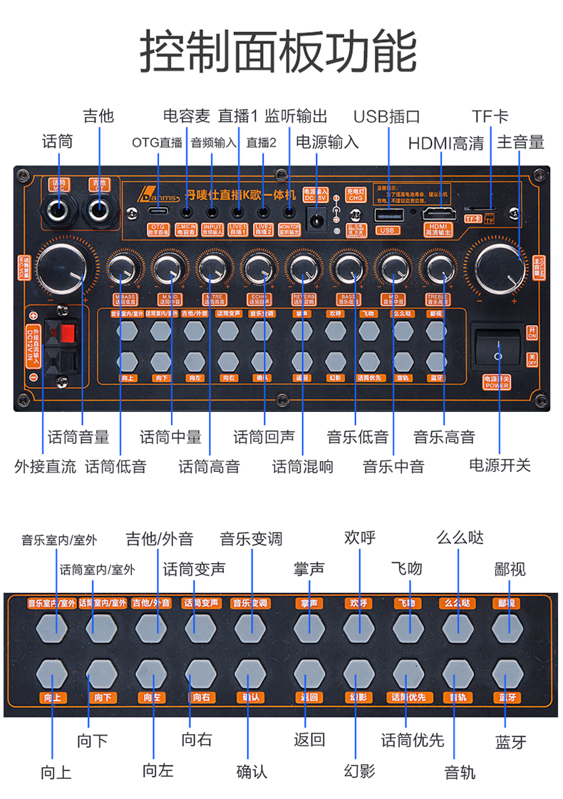 AUX外接音频输入,USB/TF读卡输入,电容咪输入,有线话筒输入,无线话筒输入,吉他输入。