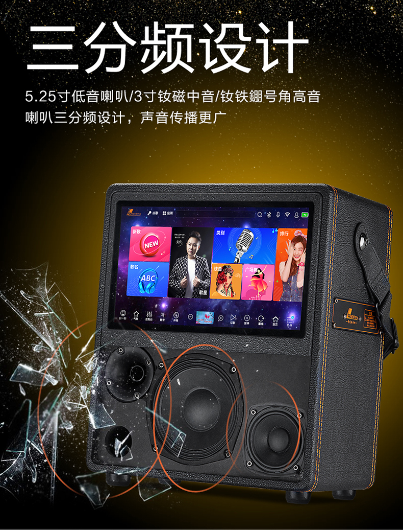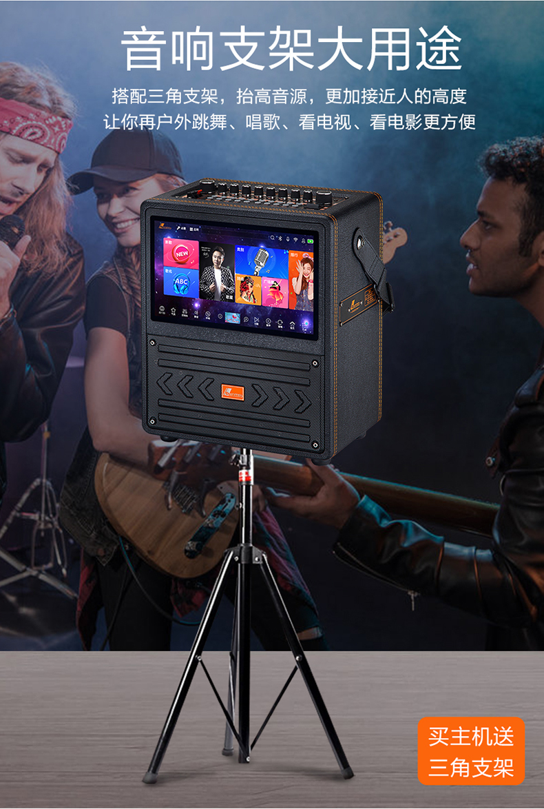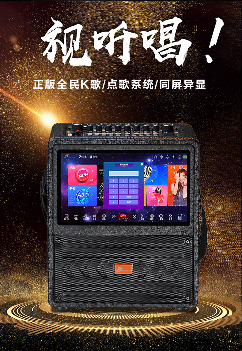 内置12寸安卓高清电容触摸屏,正版全民K歌,点歌系统,同屏异显,内置8G内存和320G,高速硬盘,可存8000+首高清MTVWIFI蓝牙,广场舞,WIFI,AI智能语音点歌,手机点歌, 5种网红特效,音频户外室内模式切换,话筒户外室内模式切换,3种话筒变音,伴唱,OTG数字直播,双直播口,电容咪,耳机监听,音乐,话筒,伴奏,混响,回响,音乐高中低音, 话筒高中低音单独调节