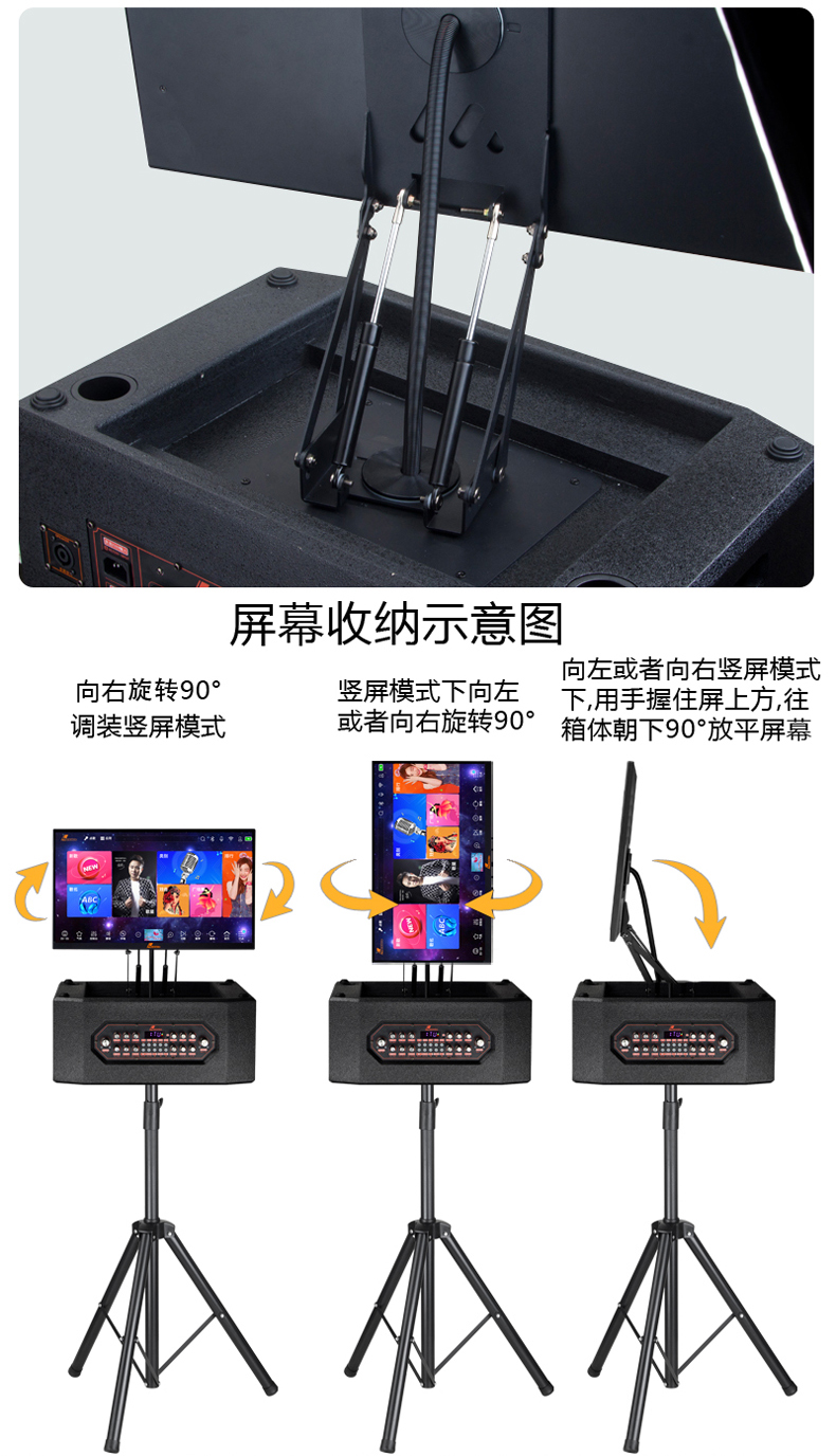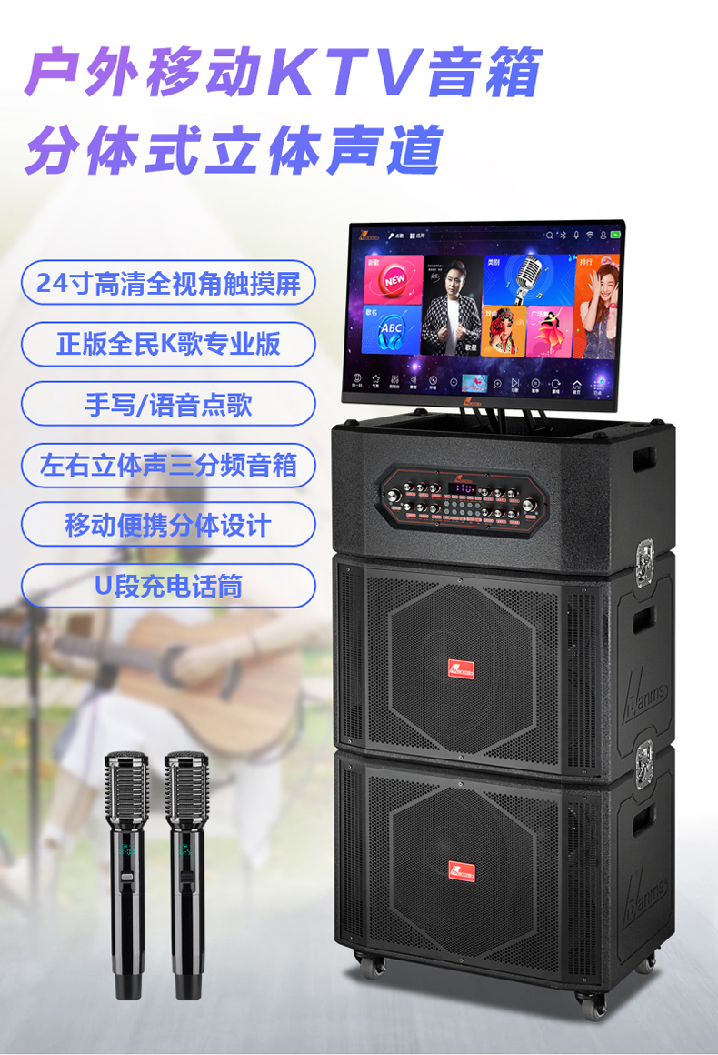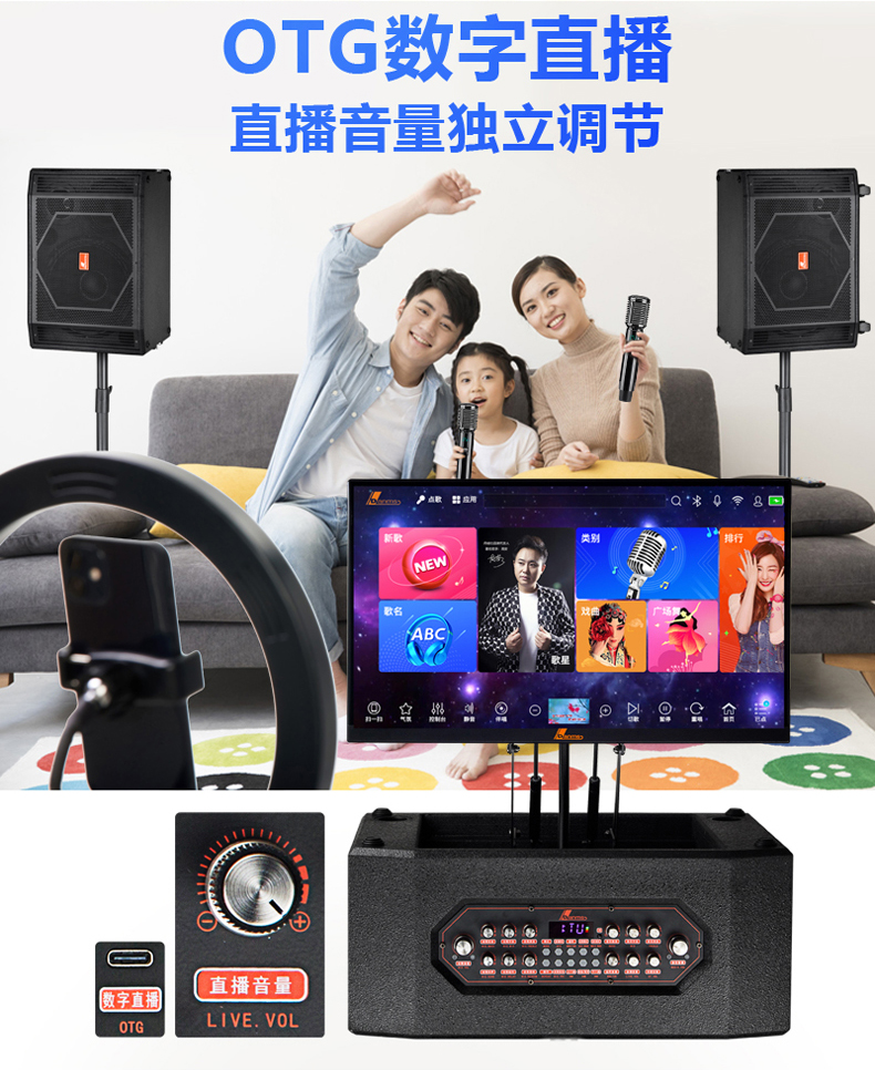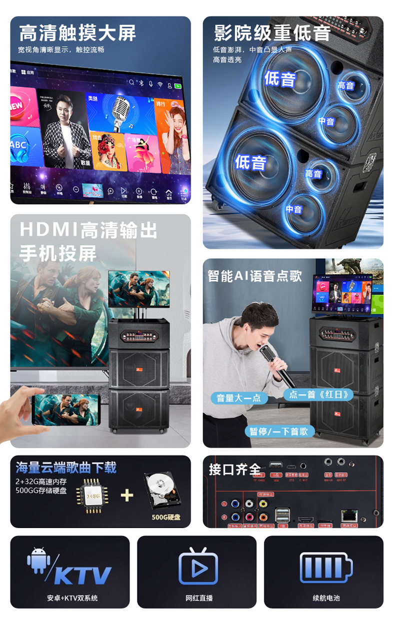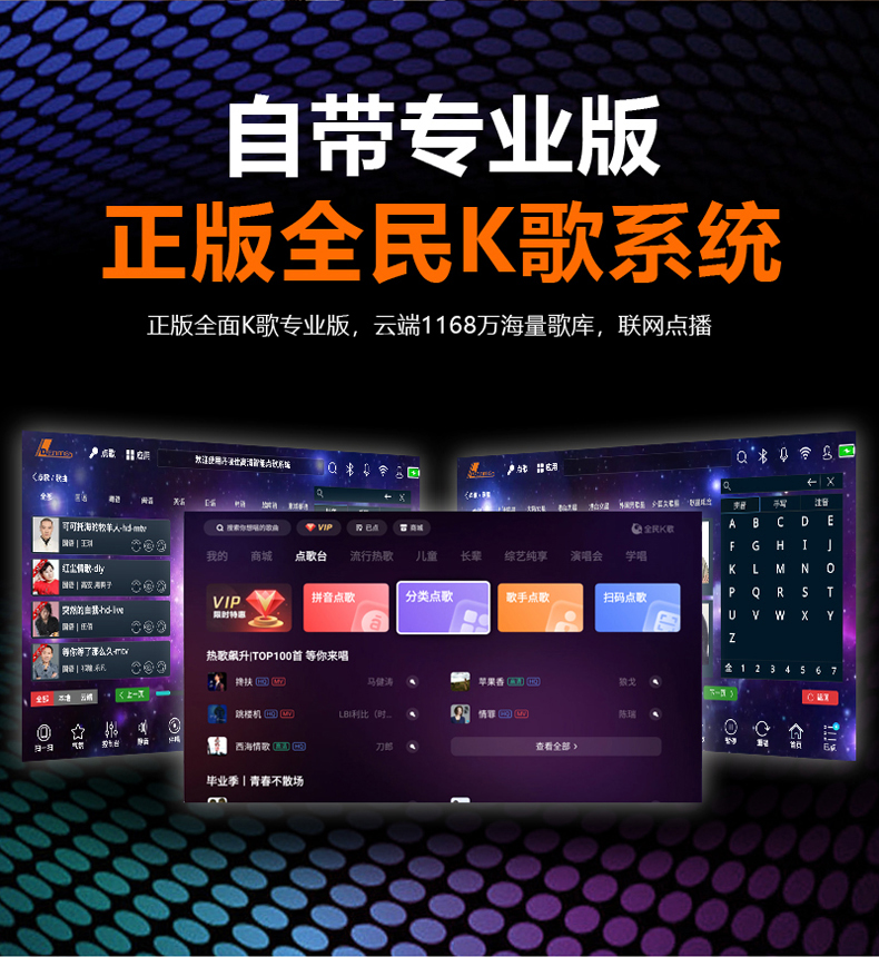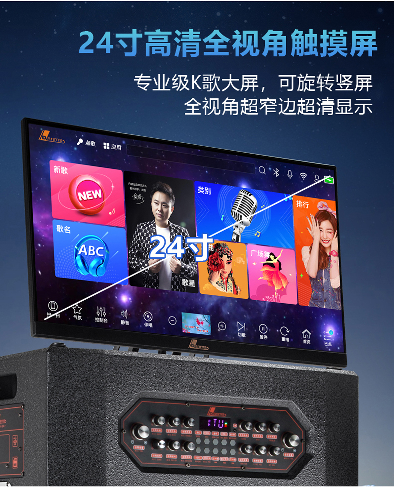 内置24寸高清全视角触摸屏,可旋转竖屏,8核高速处理器,内置2+32G+500G,可存8000余首高清歌曲,搭载正版全民K歌专业版,云端1168万海量歌库,HDMI输出,同轴输出,OTG数字直播,音频话筒两种模式切换,混响模式切换,话筒优先,,防啸叫,耳机监听,音乐,话筒,混响,回响,延时,音乐高中低音,话筒高中低音单独调节,吉他高低音调节,吉他音量调节,直播音量独立调节