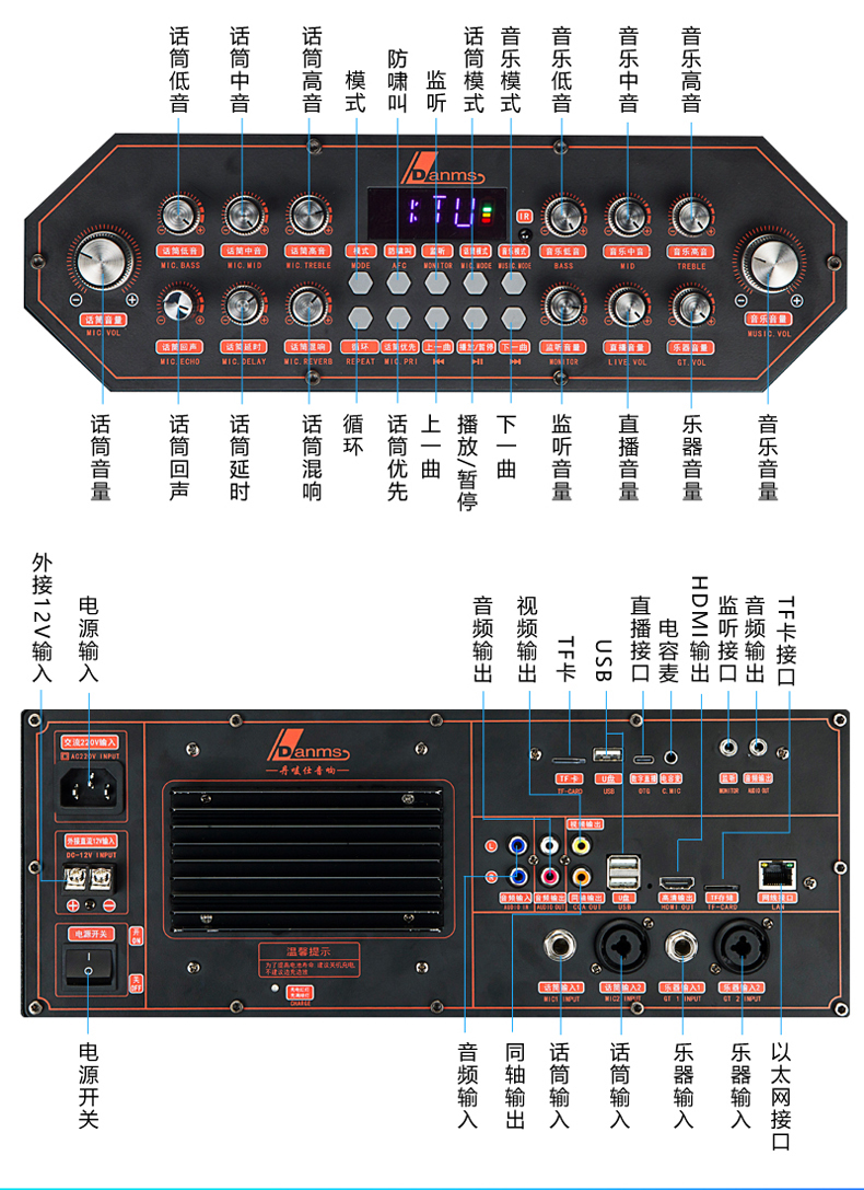 AUX外接音频输入,USB/TF读卡码输入,有线话筒输入,无线话筒输入,吉他输入,以太空网线输入