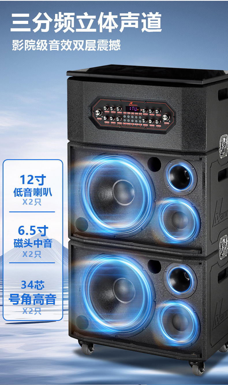 双12寸低音喇叭,2个6.5寸磁头中音,2个34芯120磁号角高音